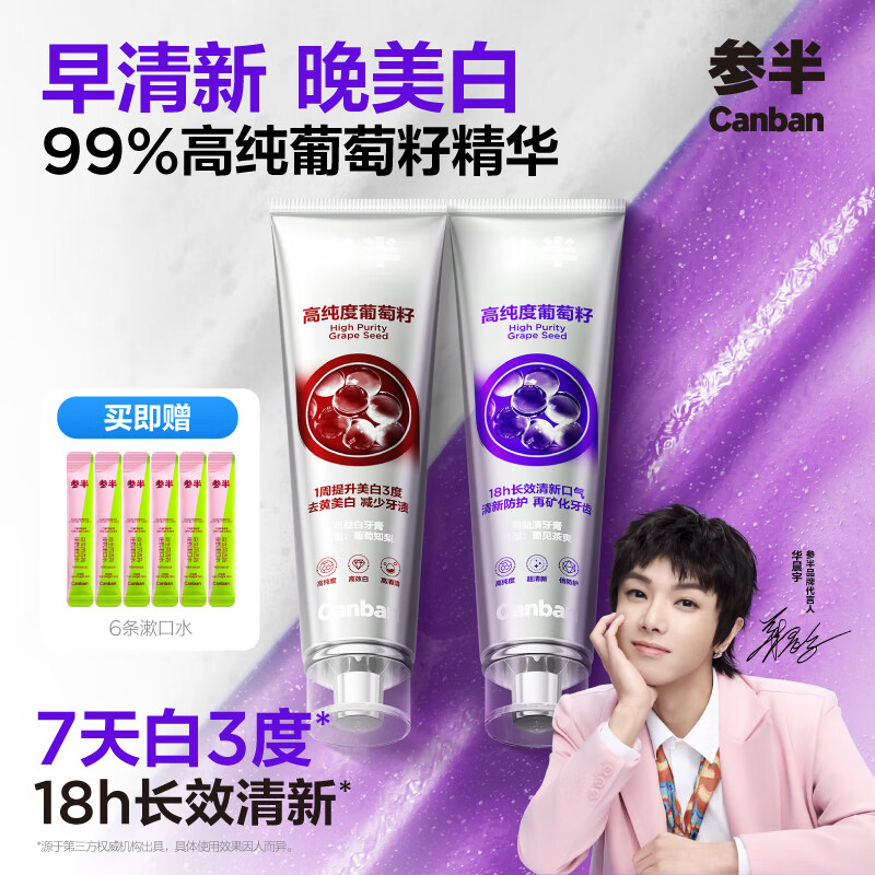 别再犹豫了!这样一款集美白、清新、护龈于一体,且拥有超高好评和超低价格的牙膏,绝对是您口腔护理的不二之选。现在就点击下方链接,把参半葡萄籽美白牙膏带回家,开启您的亮白笑容之旅吧!