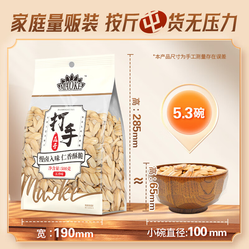 还在等什么?洽洽MAOKE打手瓜子500g,水洗脱皮大颗粒,现在秒杀价仅需19.9元!超500万条评价,99%好评率,品质保证,美味不容错过!