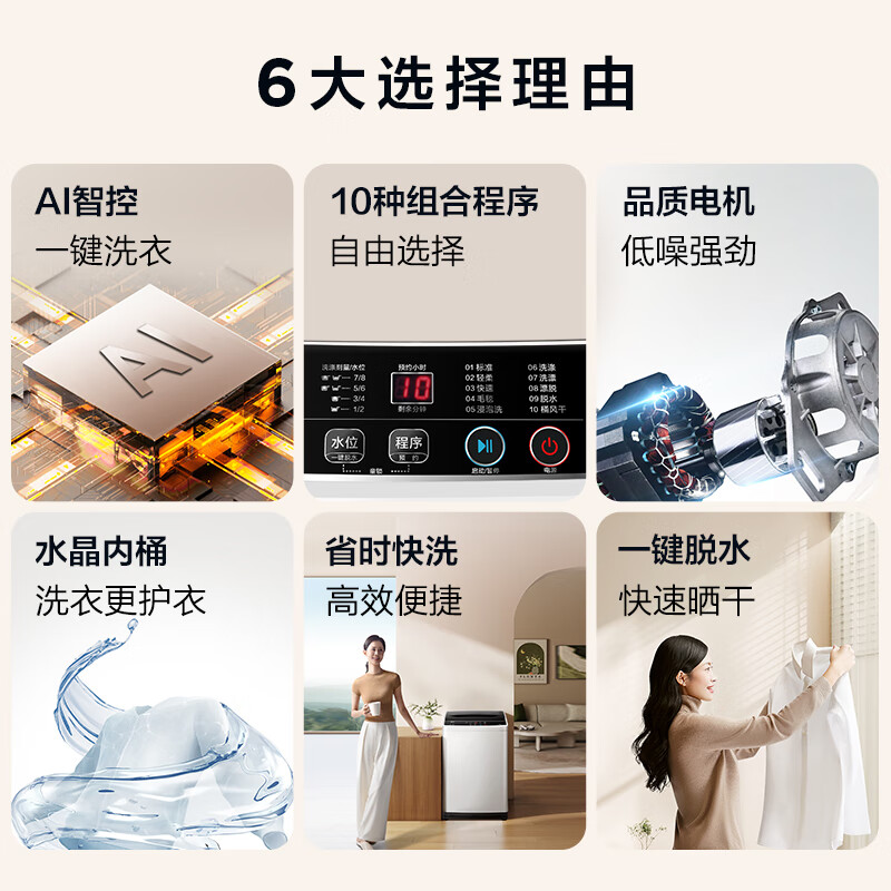 1. 7KG黄金容量,小巧不占地: 对于单身贵族、情侣或学生党来说,7KG容量刚刚好,能满足日常衣物洗涤需求,而且机身小巧,不占用过多空间,无论是阳台、卫生间还是宿舍,都能轻松安放。