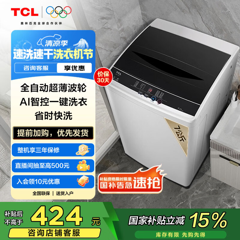 还在为洗衣烦恼?TCL 7KG全自动波轮洗衣机,原价1099元,现在百亿补贴+国补双重优惠,到手价仅需989元!模糊控制、24小时预约,租房宿舍必备,速抢!
