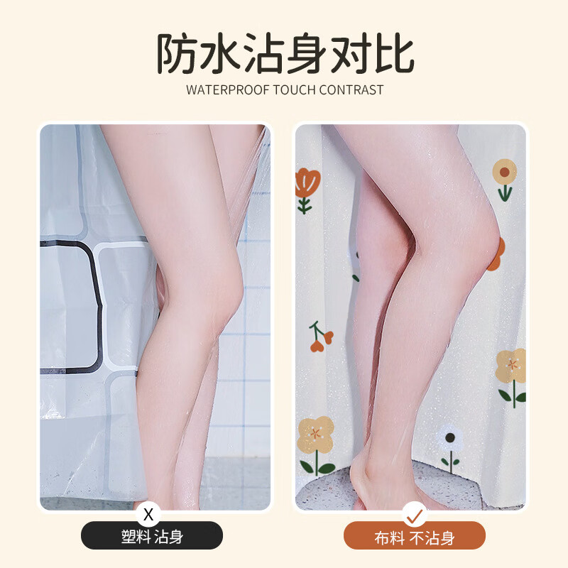 传统浴帘需要打孔固定,而这款产品采用加厚涤纶材质,通过挂环直接挂在浴室门框或横梁上,无需破坏墙面,特别适合租房党或不想留痕迹的用户。