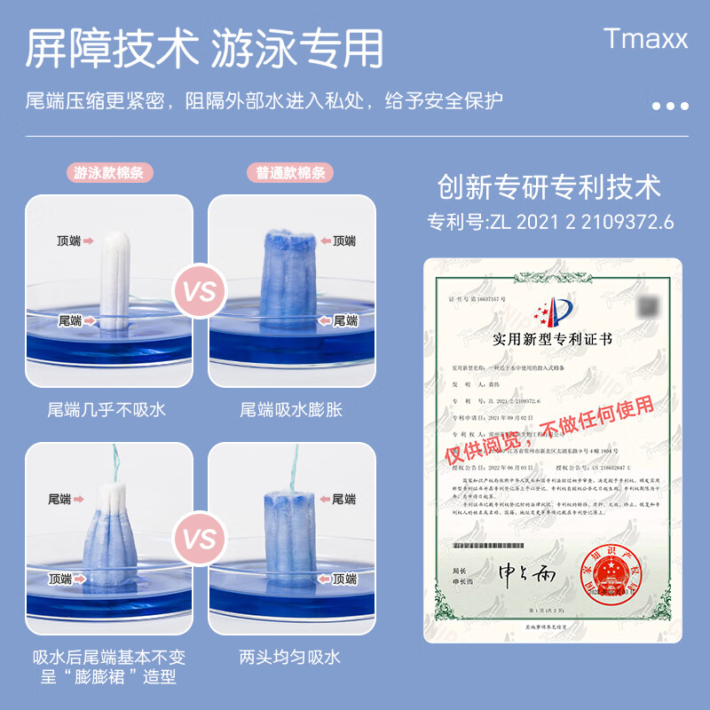 - 防水设计:无论在游泳池中奔跑还是潜入温泉,Tmaxx卫生棉条均能为你提供全天候的保护。