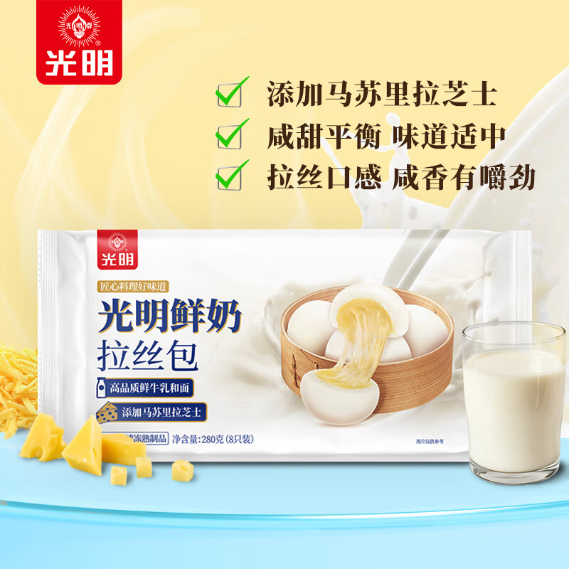 光明 鲜奶拉丝包子馒头280g/袋八只:马苏里拉芝士速冻早餐面点