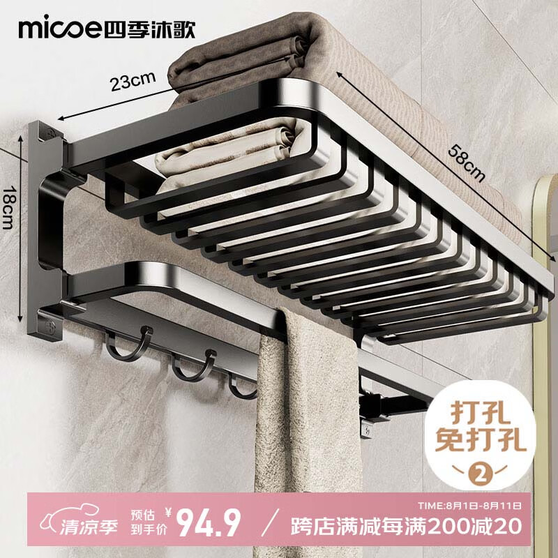 带给你的浴室一个全新体验,现在就能以仅需94.9元购得这款时尚实用的毛巾架!四季沐歌(MICOE)卫生间置物架不仅设计优雅,更是免打孔安装,简单而便捷。