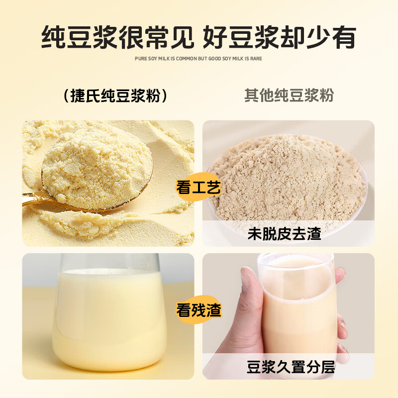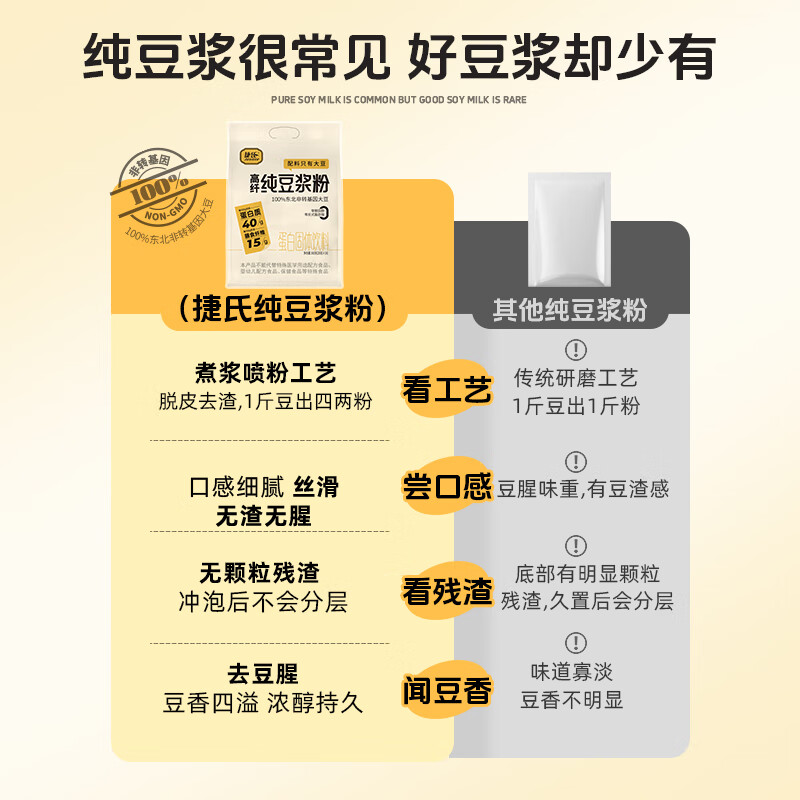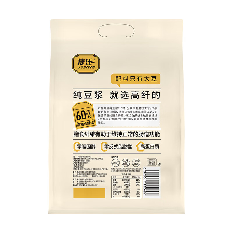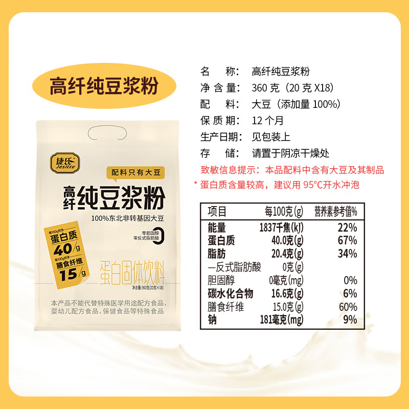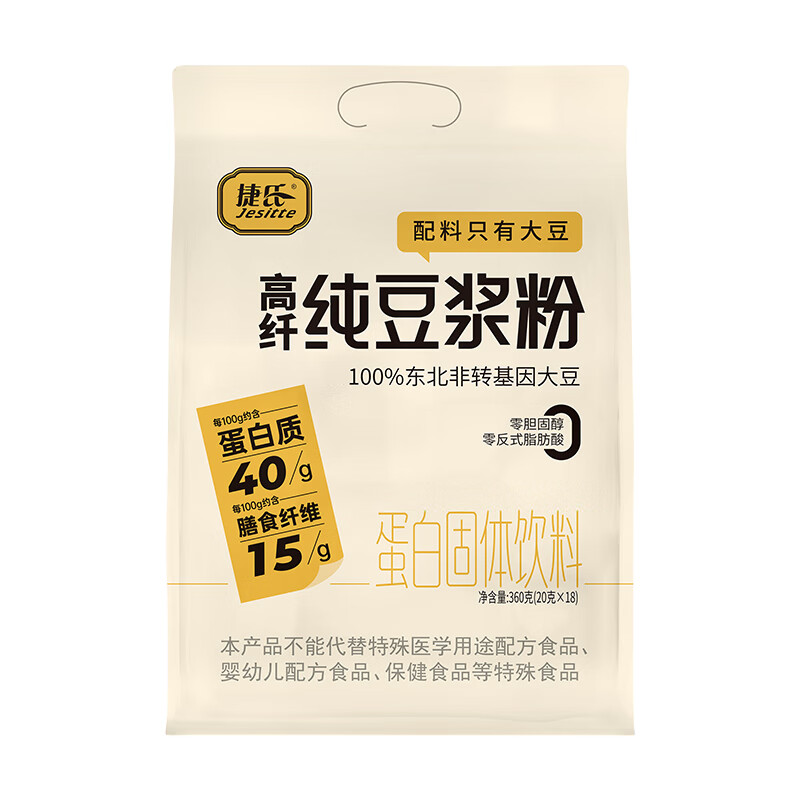准备好迎接一天的健康与活力吗?捷氏的无糖高纤纯豆浆粉是您理想的早餐选择,以其100%东北非转基因大豆和丰富蛋白质成分满足您的营养需求。