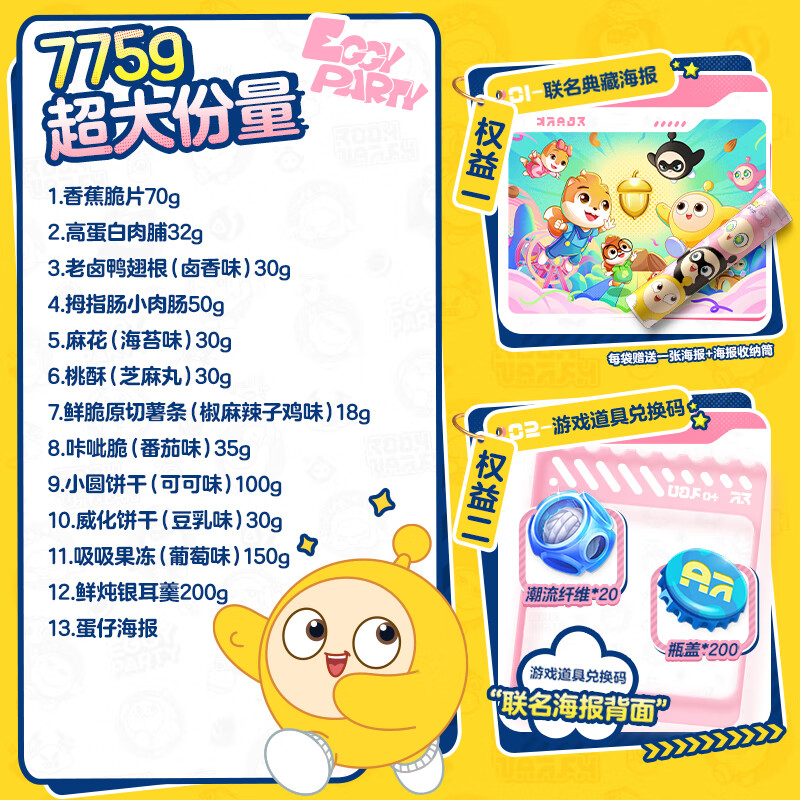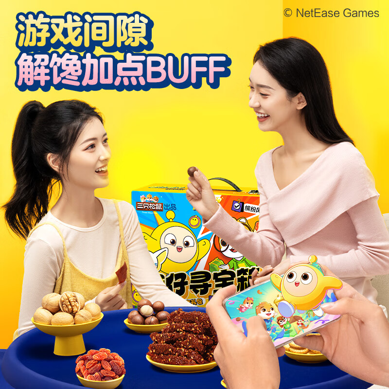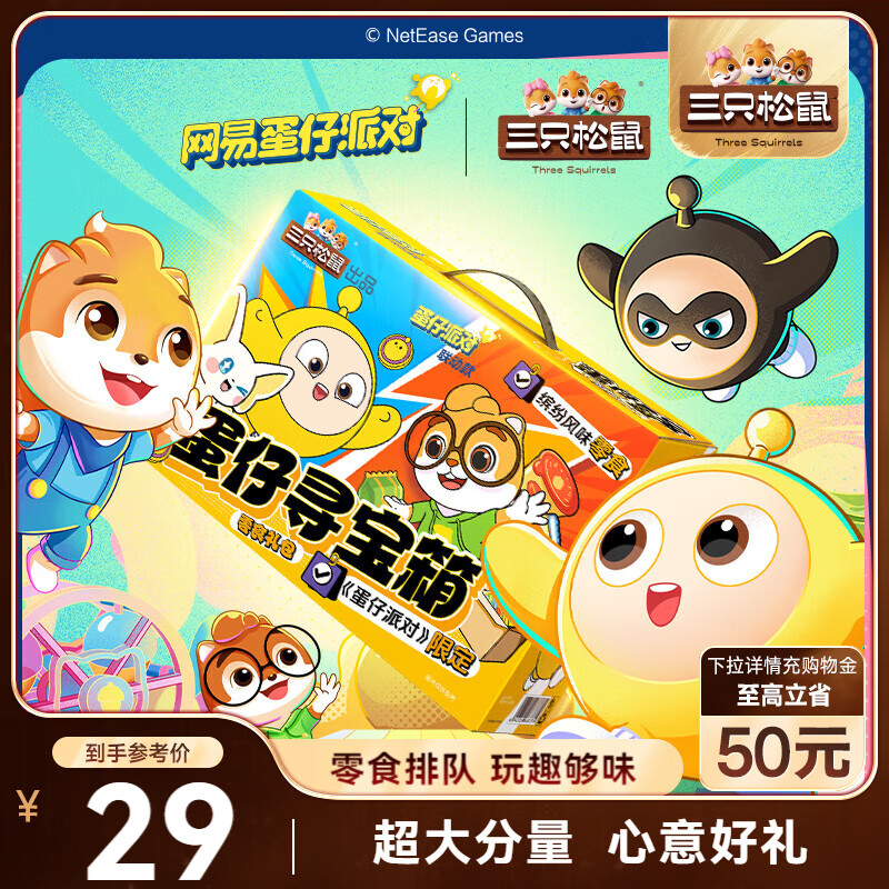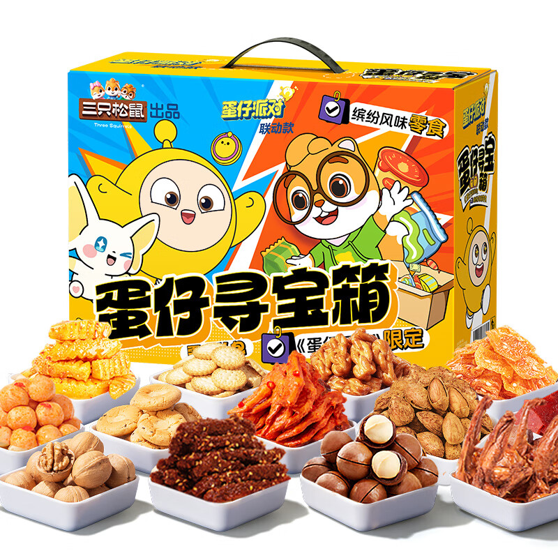 三只松鼠蛋仔联名寻宝箱 775g 是一款集坚果、蜜饯、肉食与素食卤味于一体的零食大礼包,是出游旅行中的必备伴侣!