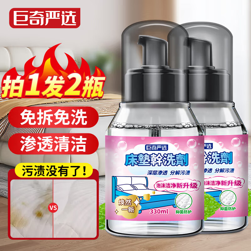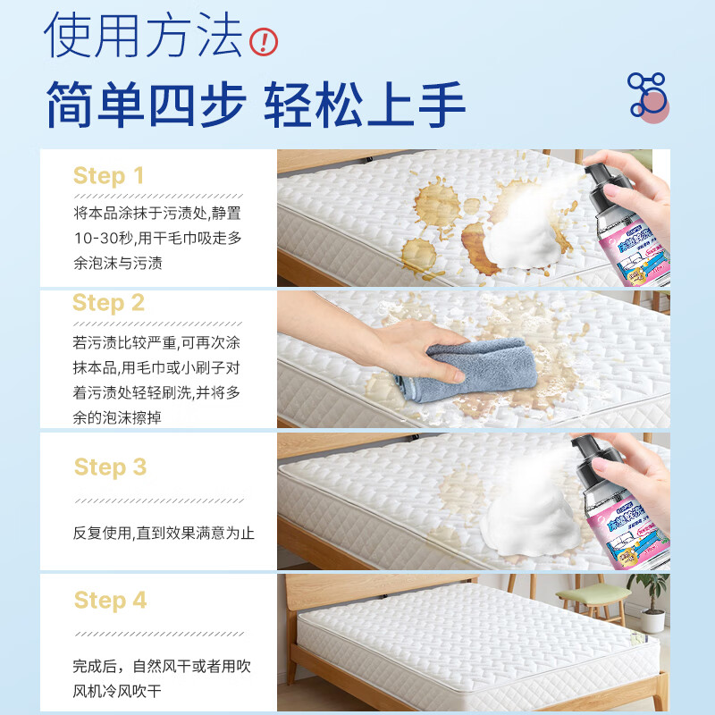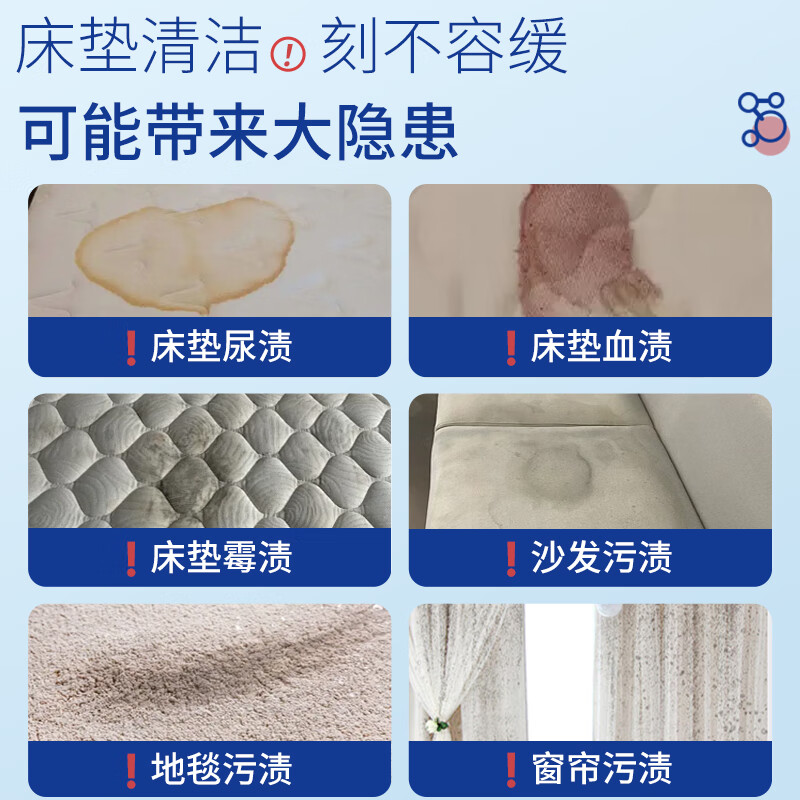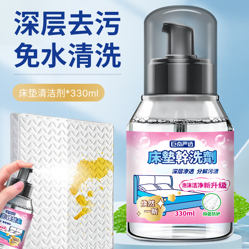 巨奇严选床垫清洗剂使用了专业的化学成分,能够深入材料中去除难以清理的尿渍和血渍。它适用于席梦思、布艺沙发及地毯等多种家居用品,不仅有效还极易使用。