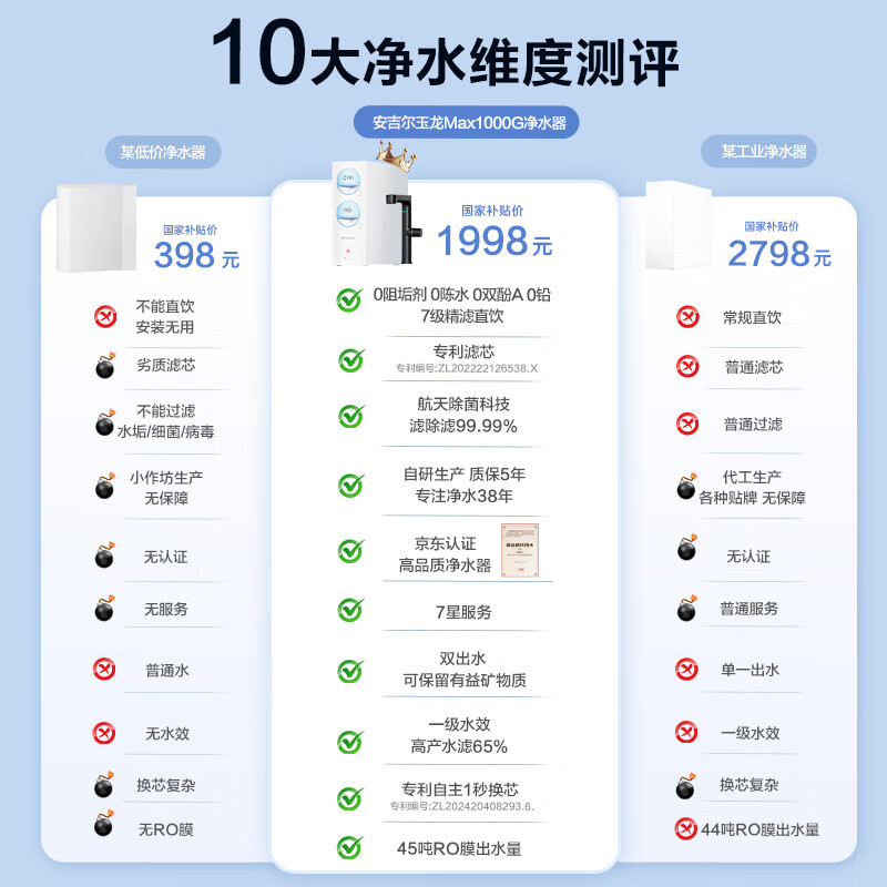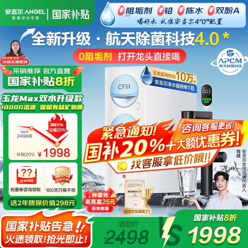 探索安吉尔玉龙Max1000G净水器的卓越性能,享受国家补贴和同类超低价。高好评率与7天无理由退货机制为您提供放心购买体验。现在即可以仅3118元获取纯净生活!