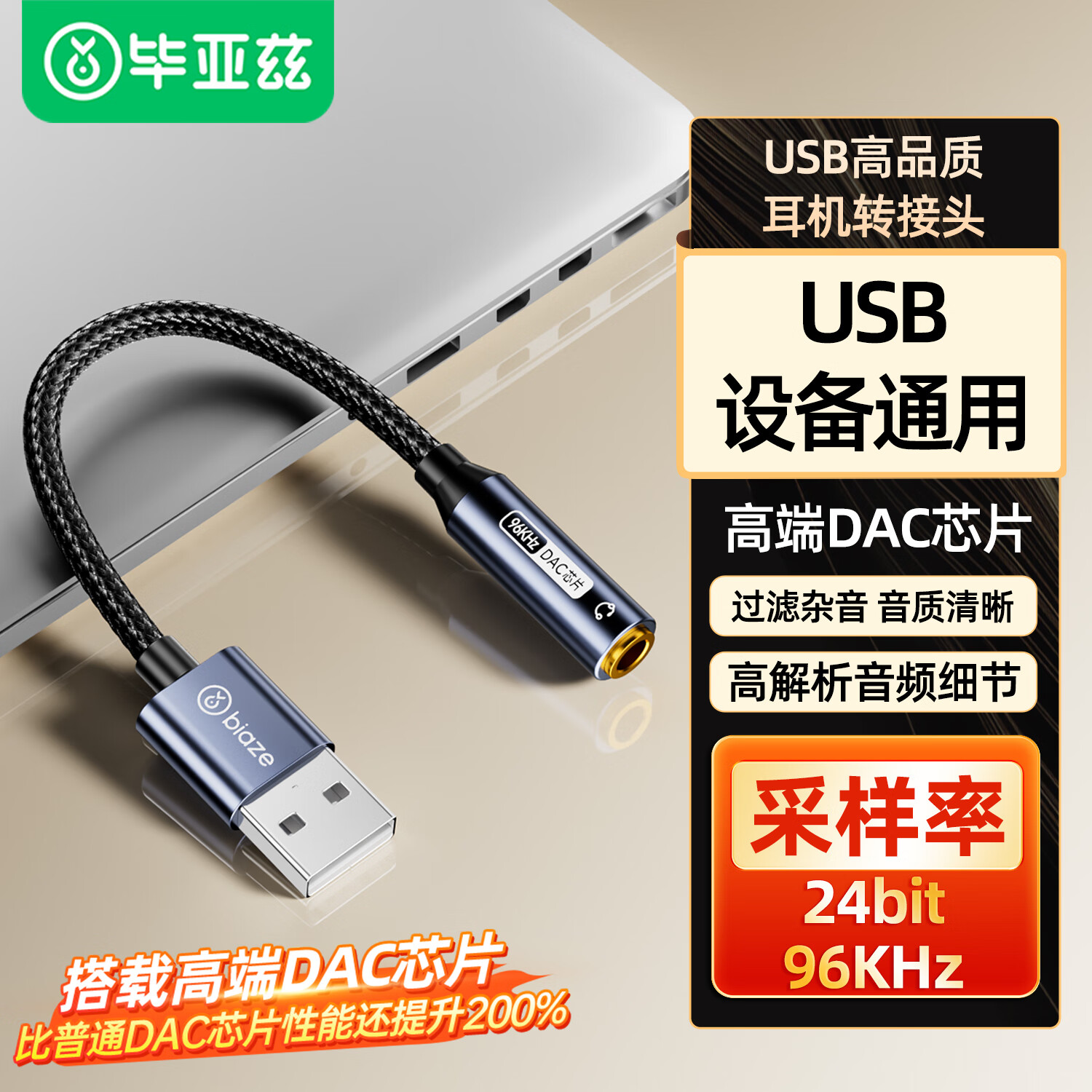 毕亚兹 【96KHZ/DAC芯片】USB转3.5mm外置声卡耳机麦克风二合一转换器音频转接头