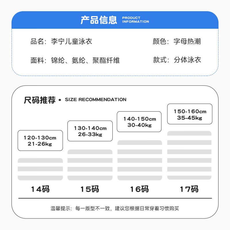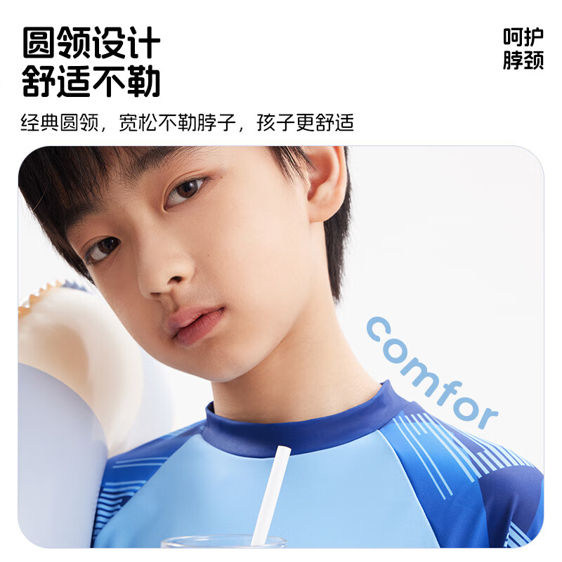- 舒适材质:采用经典的分体两件设计,既方便穿脱又大气不失风格,让小朋友在游泳时感受到最佳的身体自由度。
