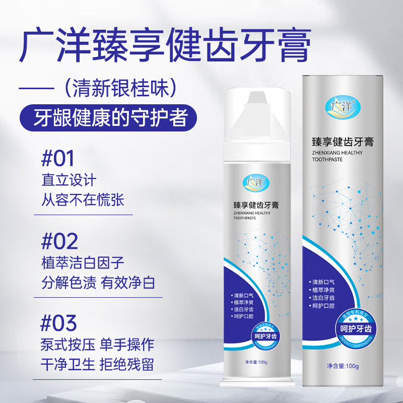 欢迎来到我们的产品分享,今天为您介绍广洋臻享健齿牙膏——以银桂花香料配方打造的优质口腔护理品。不仅口感满意、更让人惊喜的是,现在只需1元就能拥有这款100g的清新牙膏!