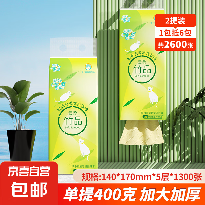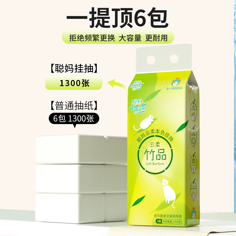 超值推荐:【加厚加量】云柔竹品1300张悬挂式抽纸巾
