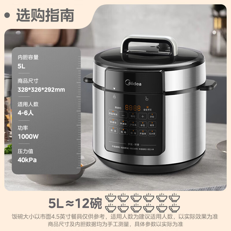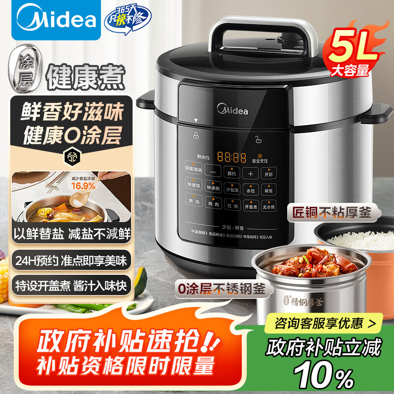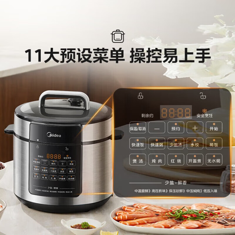 美的(Midea)0涂层电压力锅是您家用厨房不可或缺的伙伴,现以极具竞争力的优惠价398元提供给您!