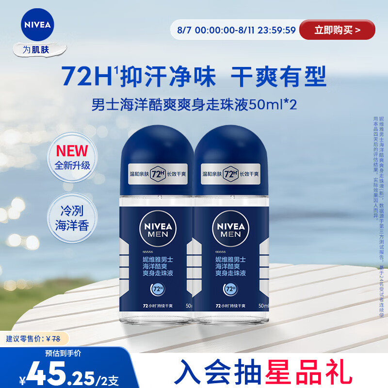 想知道更多关于此产品的信息或直接购买,请点击妮维雅男士海洋酷爽走珠液。现在就享受优惠,只需78元即可拥有!