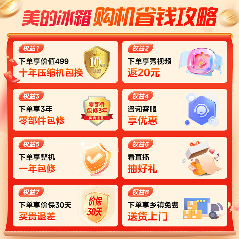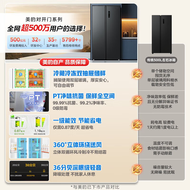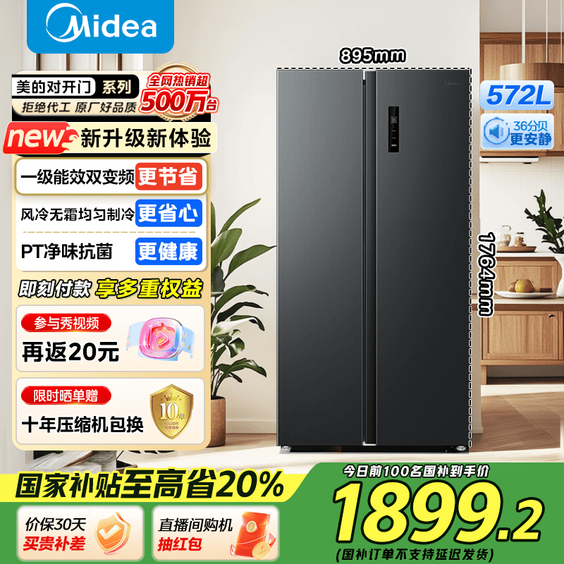 探索美的(Midea)572升风冷无霜双开门冰箱,享受国家补贴20%优惠,现在购买价格仅需¥2374。大容量、一级能效和风冷无霜技术是其亮点之一。好评率高达99%,总评论数10,000条!