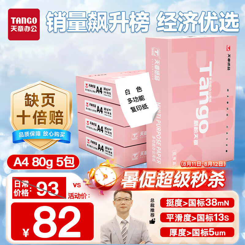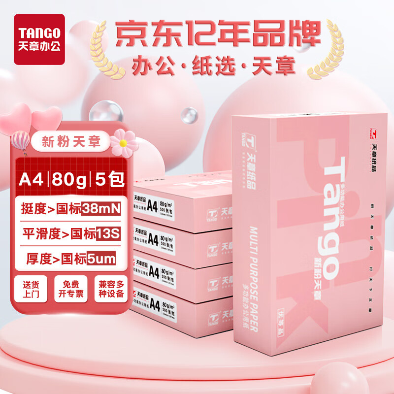 天章(TANGO)新粉天章A4纸打印纸,80g、500张×5包、共 2500 张的经济款,是办公、学习和复印的优质选择。无论是日常文件打印、会议纪要,还是学生作业,都能提供清爽的白色纸张和稳定的打印效果。