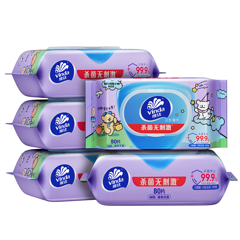 维达杀菌湿巾 80片*5包 限时特惠:仅售 67.9 元!