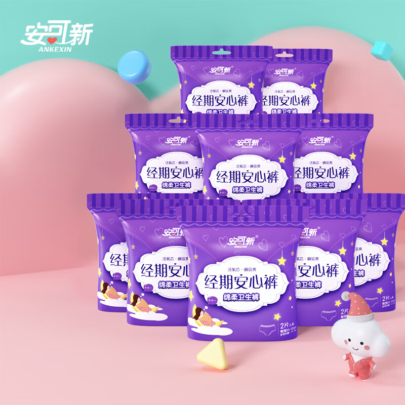 安可新推出的安心裤安睡裤型卫生巾专为夜间使用设计,采用医护级超熟睡防漏绵柔面料,长加长版型,提供更贴合、舒适、可靠的防漏体验。产品包装为L码2片*10包,适合经期持续使用,既方便又经济。
