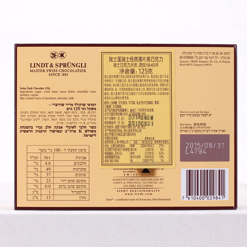 瑞士莲(Lindt)经典薄片黑巧克力片125g 进口 黑巧 生日礼物