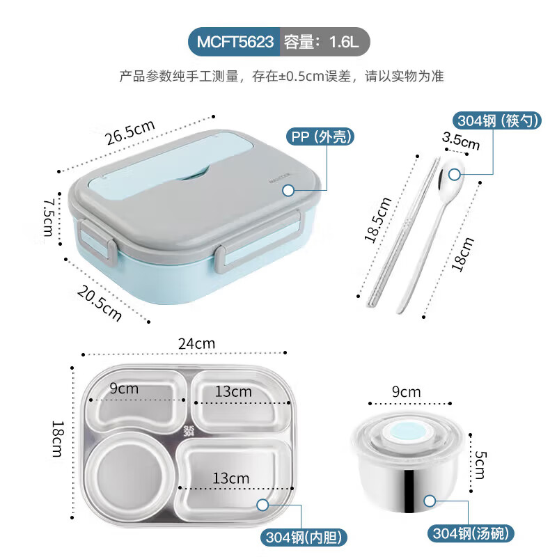 - 1.6L 容量:足够一人一餐,满足学生午餐需求。