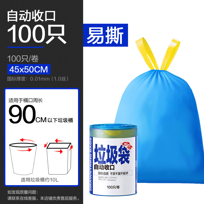 这款10L容量、100只装的蓝色自动收口垃圾袋,以11.99元的优惠价上市,拥有99%好评率、便宜包邮与7天无理由退货保障。