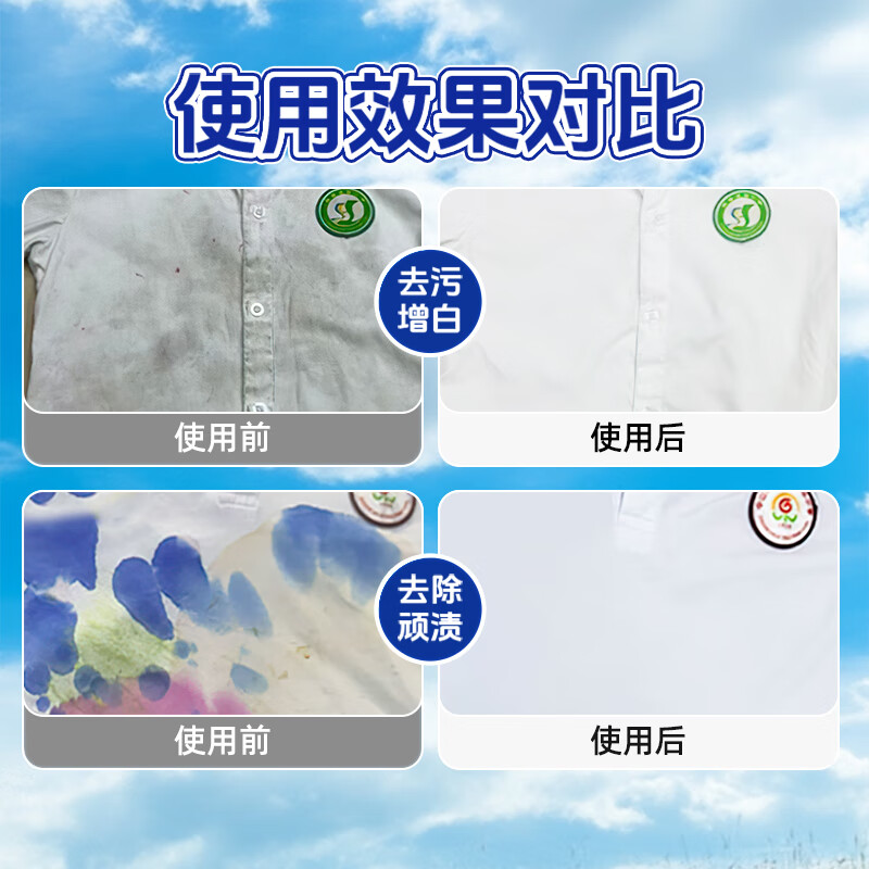 - 彩漂粉漂白剂:专为彩色衣物设计,安全去黄、去污,颜色更鲜亮。