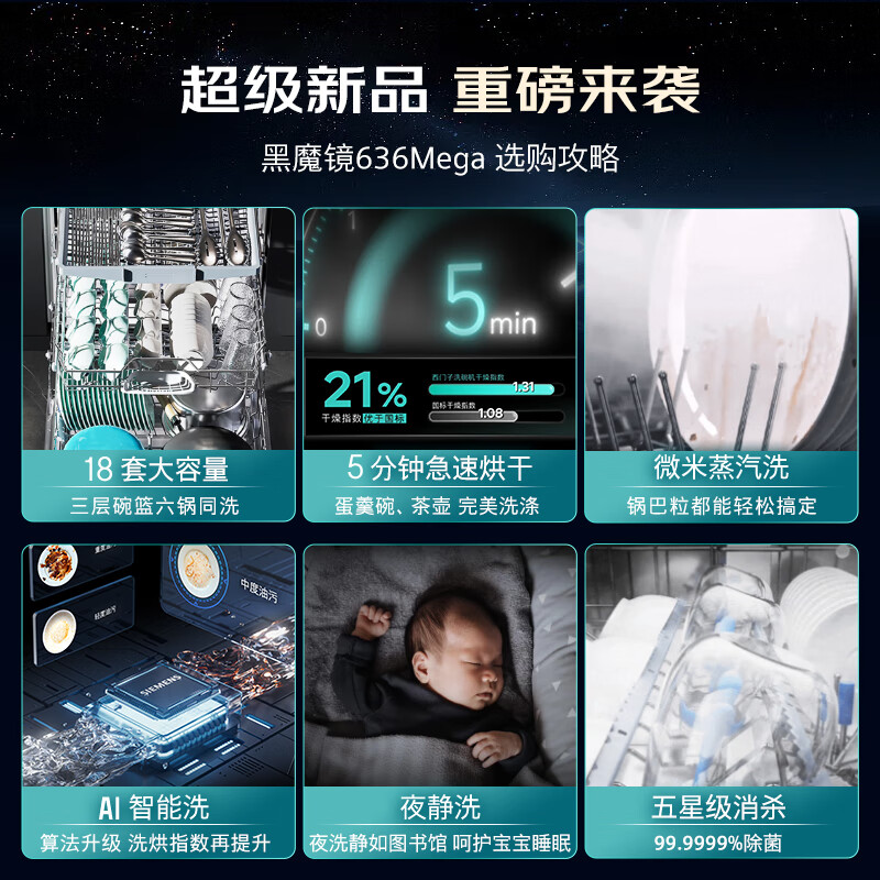 西门子(SIEMENS)黑魔镜636Mega全能舱结合18套碗篮与3层碗篮设计,兼具高效洗涤与快速烘干功能。产品通过双一级认证,能省水省电,真正做到“省时省力”。现价仅 8499 元,远低于市场原价,适合追求高性价比的家庭厨房。