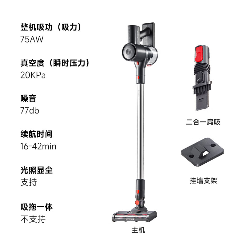 - 高吸力 + 大功率:采用全新高效电机,强劲吸力轻松吸走猫狗毛、地毯尘埃。