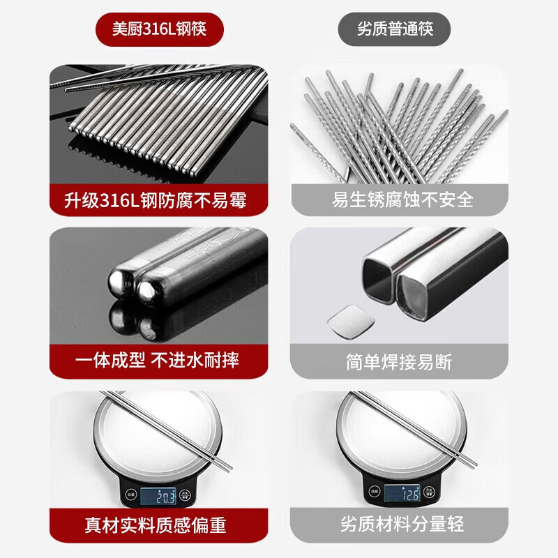 美厨(maxcook)316L不锈钢防滑筷子10双装,超值48元,超高好评率!