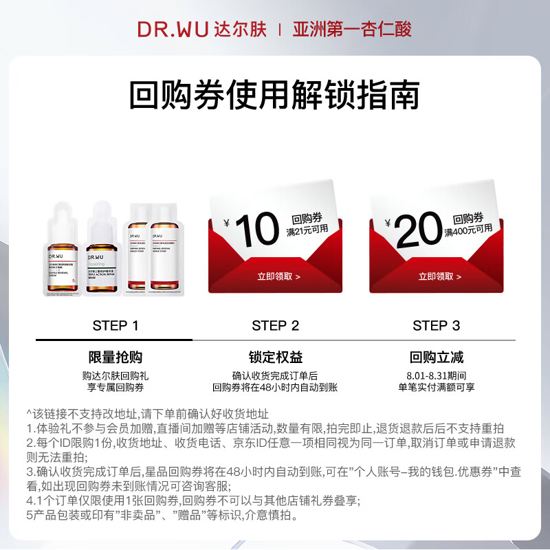 达尔肤(DR.WU)杏仁酸8% 2ml+三修精华2ml+抛光水1.0 2ml*2 仅需70元,限时特惠!
