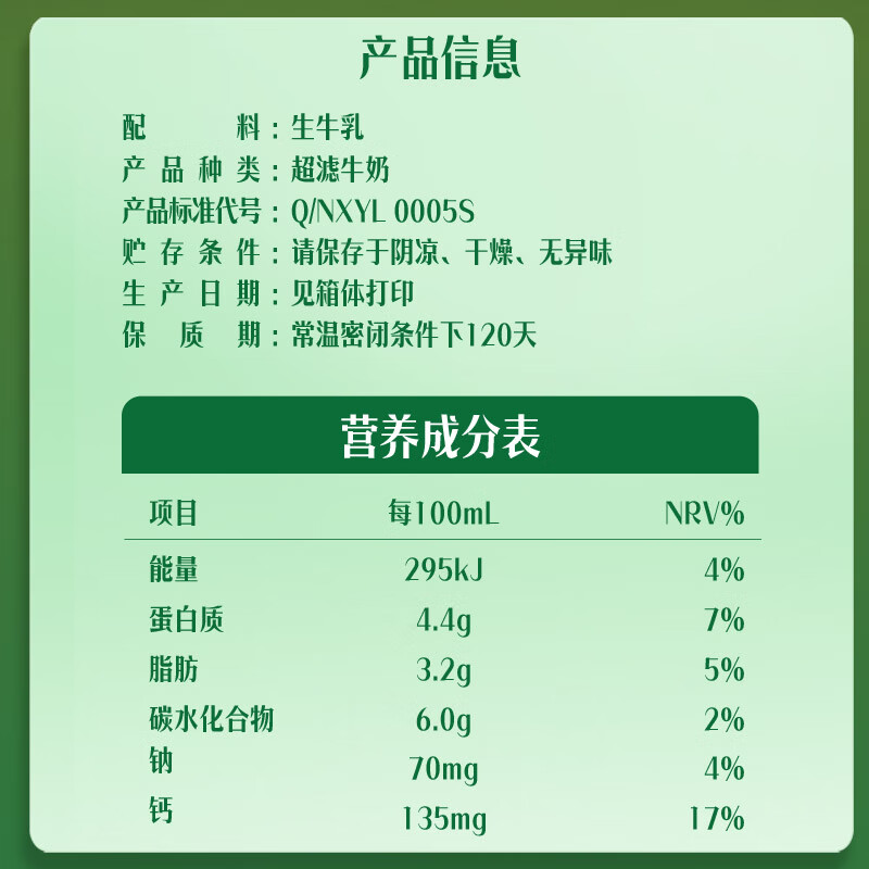 - 高蛋白质:每 250ml 纯牛奶含 4.4g 高蛋白,满足日常营养需求。