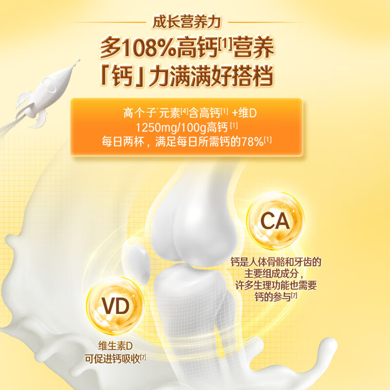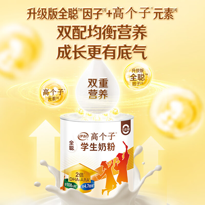 伊利高个子全聪学生奶粉 900g 6岁+专用,含高锌高钙高铁、牛磺酸、DHA+ARA,无蔗糖。好评99%,限时仅售119元,7天无理由退货。