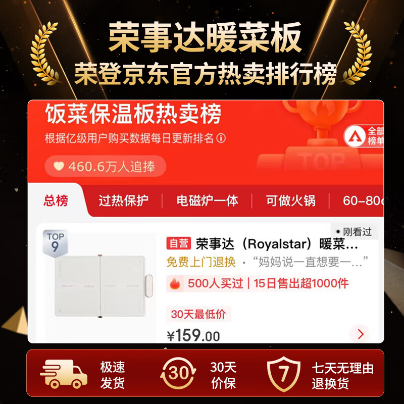 荣事达暖菜板热菜神器:仅售 98 元,立省 63 元