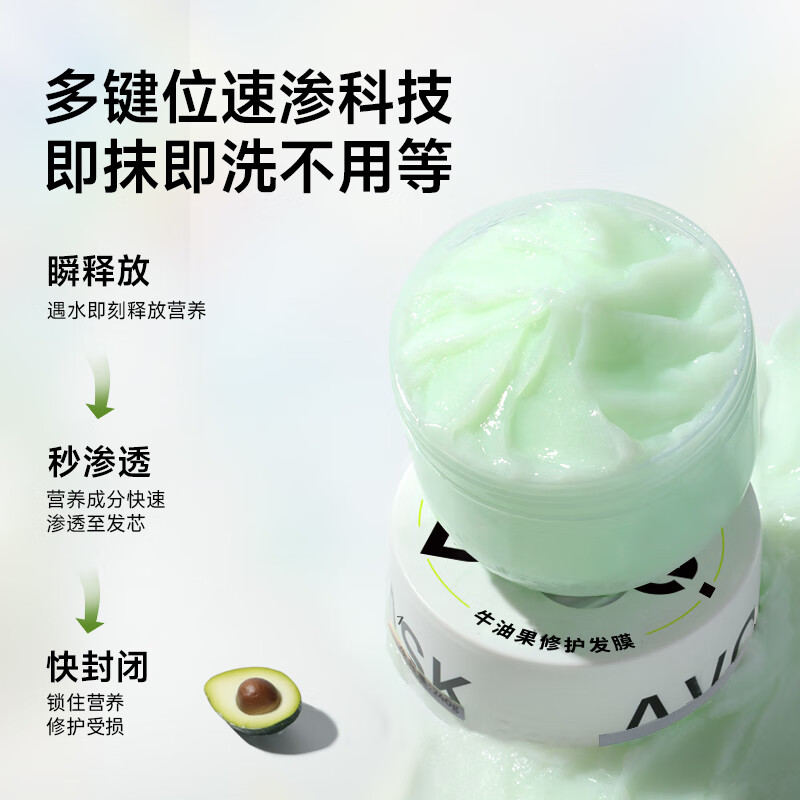 - 天然牛油果精华:富含维生素E、必需脂肪酸,深层滋养毛鳞片,补水锁水。