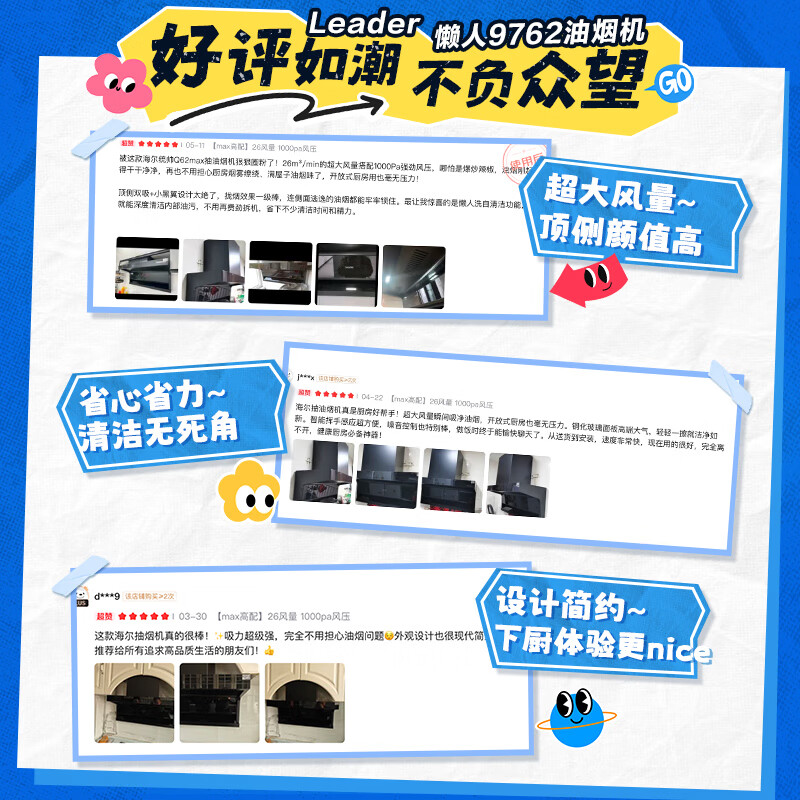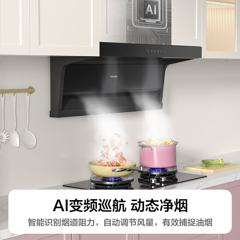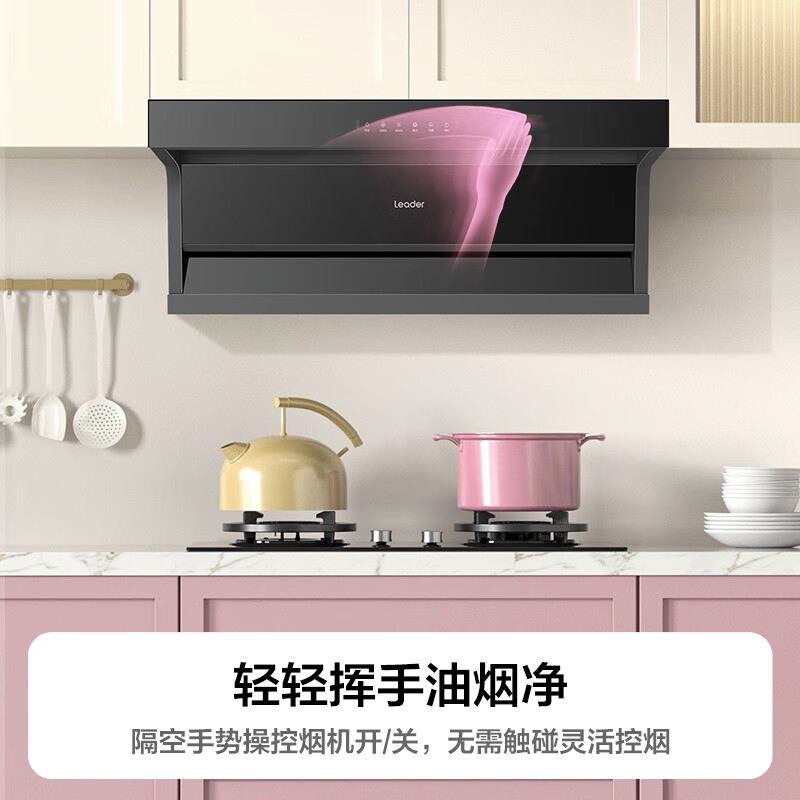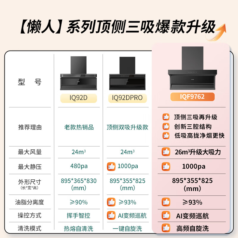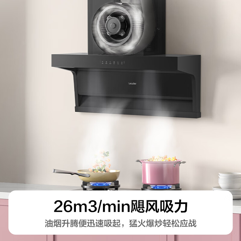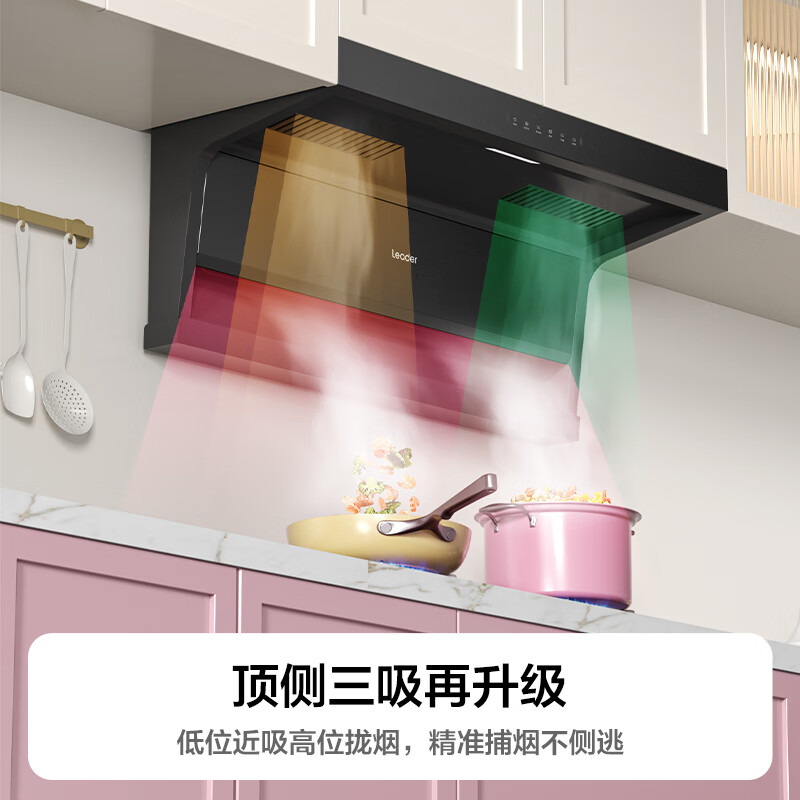 “顶侧三吸设计,油烟不再飞溅,厨房保持干净。”