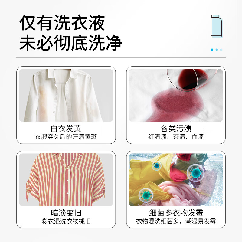 - 活氧爆炸技术:高效氧化去污,深层清洁白衣和彩衣,让污渍无处遁形。