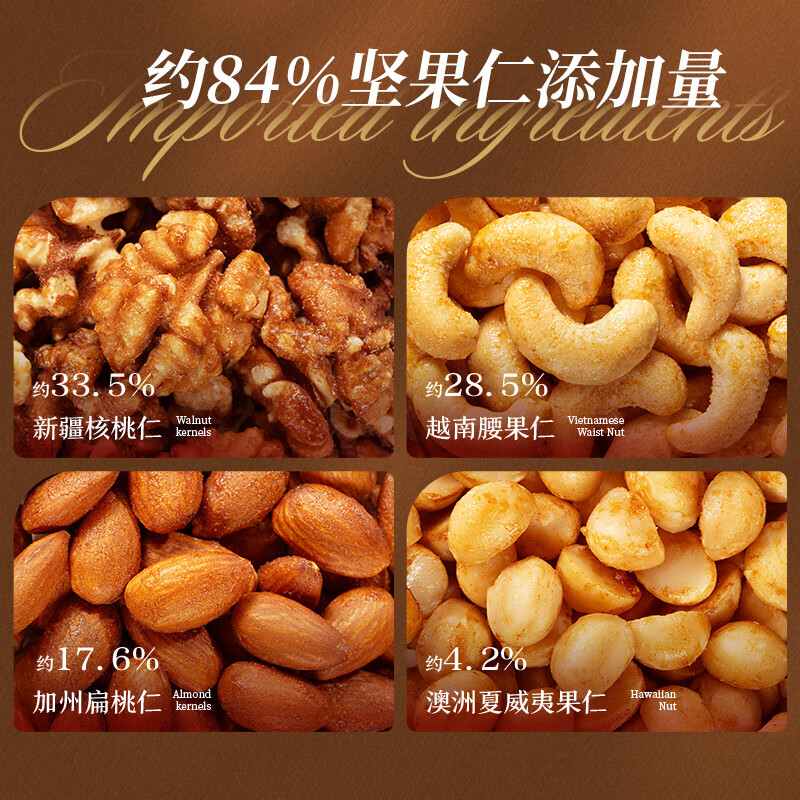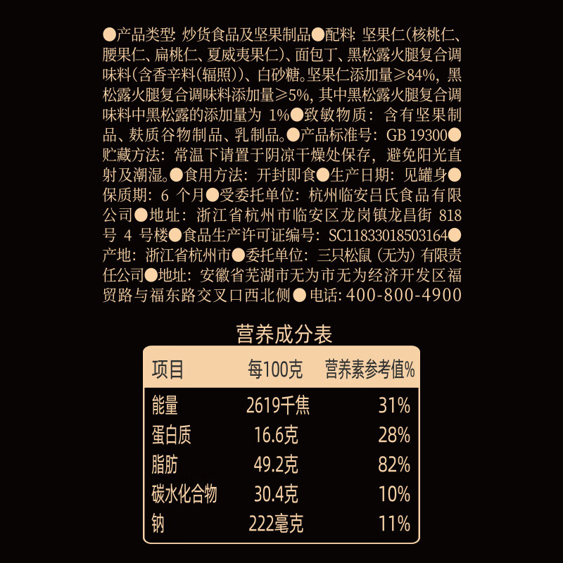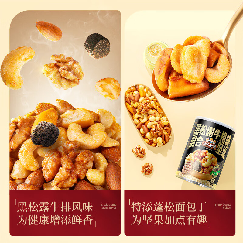- 优质原料:精选杏仁、腰果、核桃、榛子等多种干果,搭配黑松露香气,口感酥脆。