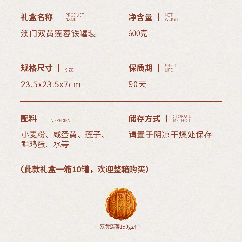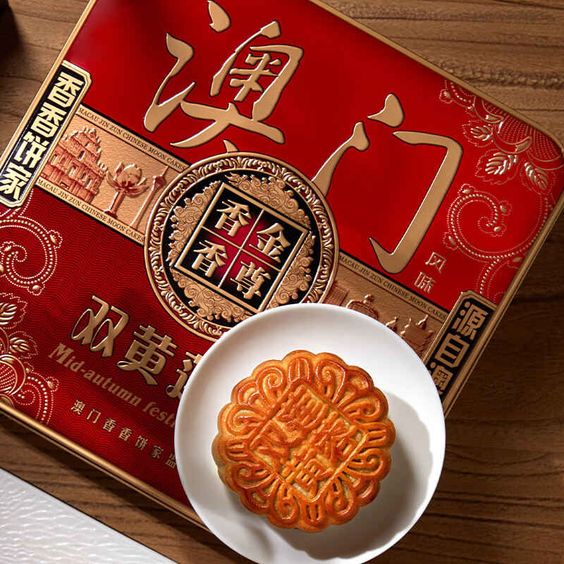 这款金尊澳门双黄莲蓉月饼礼盒采用双黄莲蓉与黄金糖酱相结合,馅料细腻绵软,外皮酥脆,口味层次丰富。每盒 150g*4 份,适合中秋团圆、企业礼品或个人馈赠。