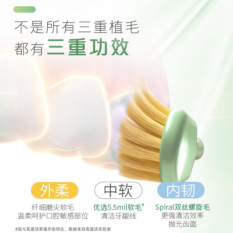 - 超细软毛:细密且柔软的毛刷头,既能彻底清洁牙齿表面,又不伤龈,适合敏感牙龈用户。