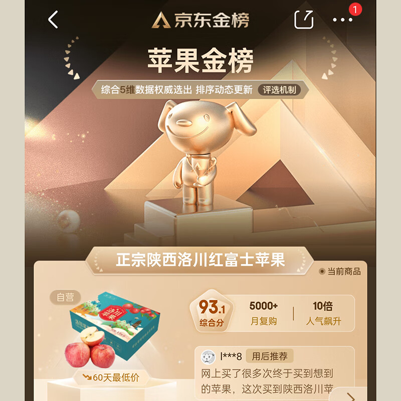 - 产品名称:京觅 陕西洛川红富士苹果 12枚单果170g+