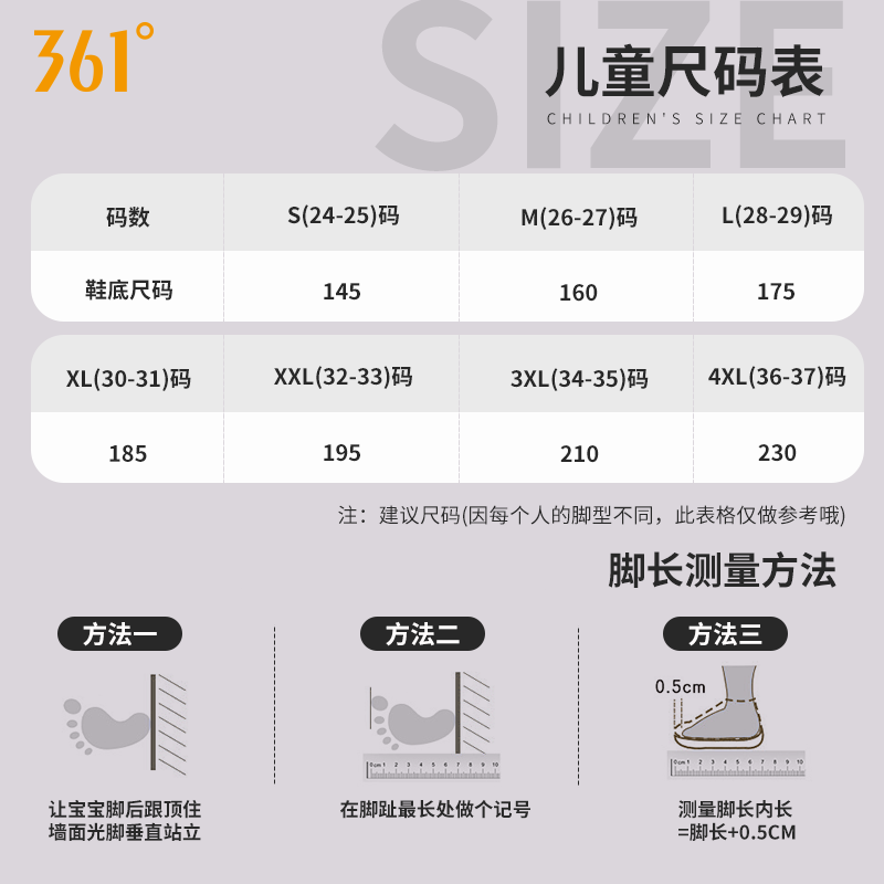 - 时尚外观:经典 361° 运动品牌标识,简约且活泼,适合小朋友的日常运动与游乐场所。
