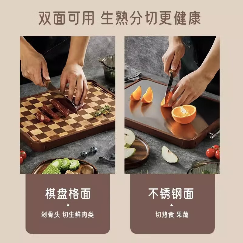 • 双面设计:左侧实木砧板,右侧不锈钢案板,满足切、削、烹饪多种需求