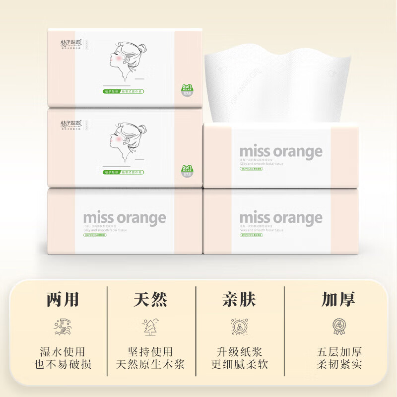 桔子姑娘大包抽纸采用 5 层厚实设计,每盒 480 张,共 5 包,一次性满足全家日常所需。适合母婴、厨房、餐厅等多场景使用,柔软亲肤、吸水性强,给你最舒适的使用体验。