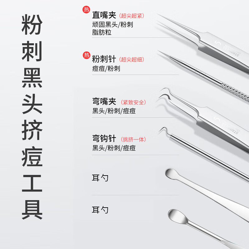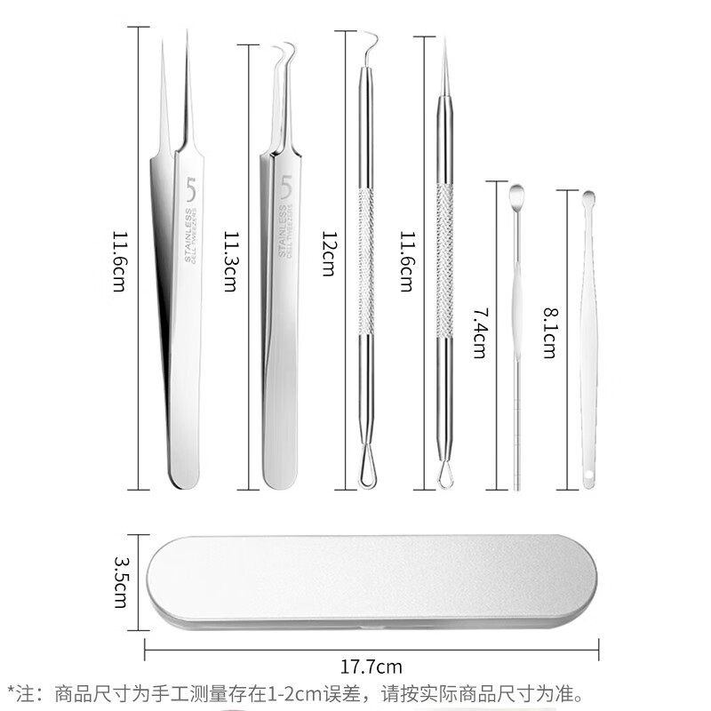 - 多功能设计:细胞夹、黑头夹、耳勺、挤痘痘神器,一套搞定各种痘痘与黑头清洁