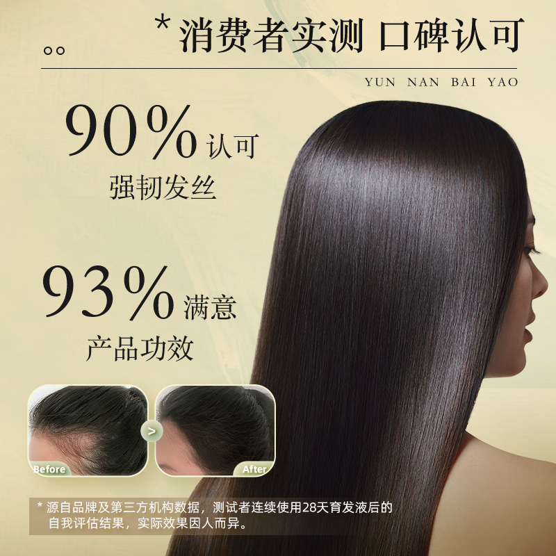 • 强韧蓬松配方:采用云南白药精粹,深入修护发根,提升发丝韧性,让头发更加蓬松有弹性。