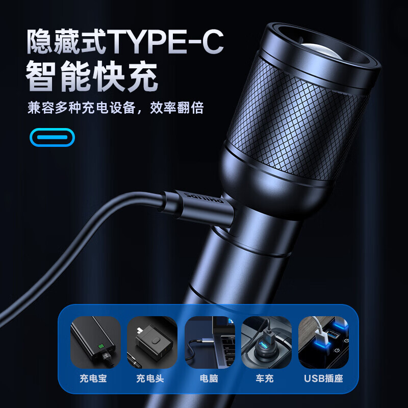 飞利浦(PHILIPS)手电筒 强光手电 超亮 超长续航 穿天家用 小型军用 户外照明 应急灯
