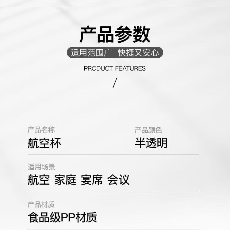 该一次性塑杯航空杯不仅容量适宜,而且材料安全环保。其食品级的材质确保了饮用的安全性,让您无忧享用各种饮料和茶水。