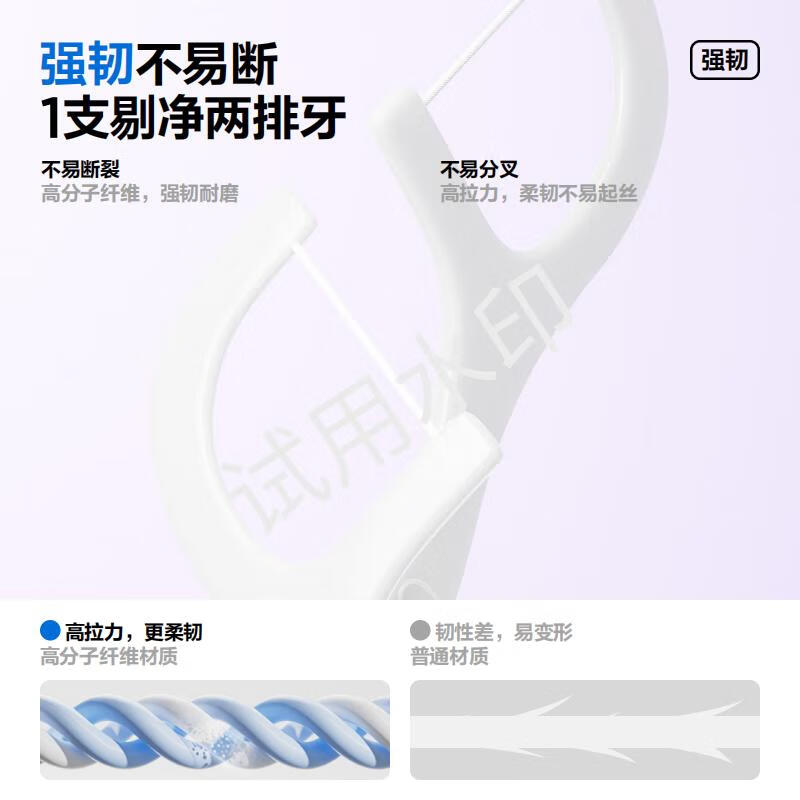 - 高韧材料不易断:参半牙线棒选用的是优质材料制成的柔韧圆线,即使在大力拉扯的情况下也不易断裂,确保清洁效果。