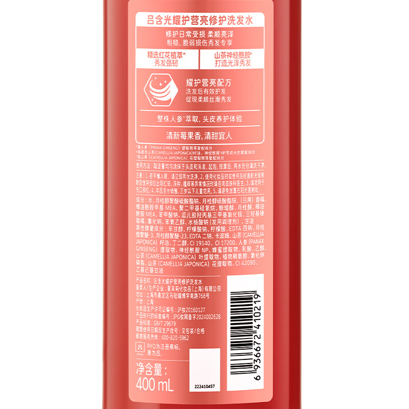 吕(Ryo)的这款400ml的洗发水以修护和保持头发水润、柔顺著称,它特别适合需要解决头发干燥、毛躁问题的人群。此款洗发水富含海洋矿物质成分以及植物精华,可以深层滋养头皮,同时修复受损发质。