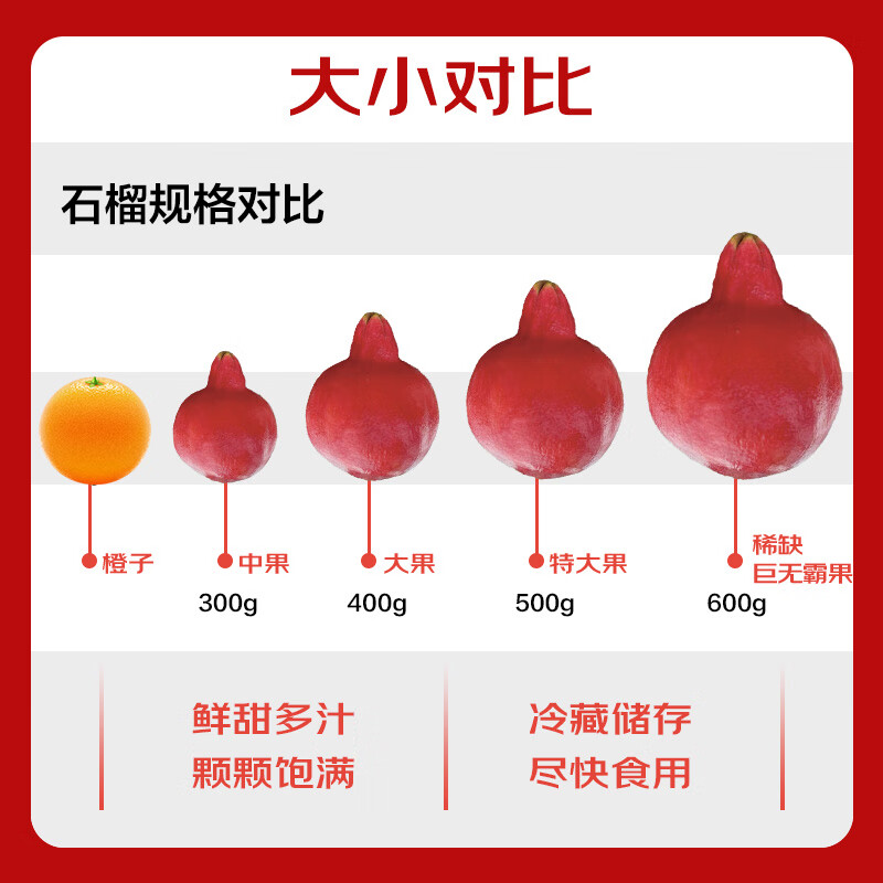 京鲜生推出的四川赤焰玛瑙软籽石榴新鲜上市了!每一颗石榴果重在300-400克之间,精选的优质果实,为您带来无与伦比的口感和营养。这款石榴不仅外形美观、色泽鲜艳,而且籽粒饱满、汁水丰富。
